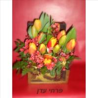 סידור בתיבת עץ, המורכב מצבעונים בשילוב עם פרחים וירקים משלימים בגוונים חמים, בתוספת שרשרת פנינים.