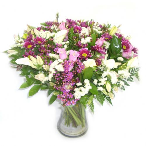 זר המורכב מפרחי העונה בגוונים של סגול ולבן.