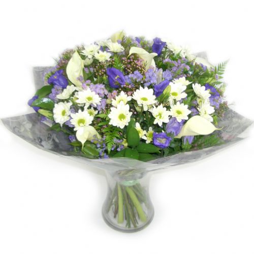זר המורכב מפרחי העונה בגוונים של סגול ולבן.