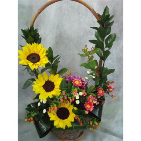 סידור חמניות מדורג בסגנון מודרני על סלסלת קש